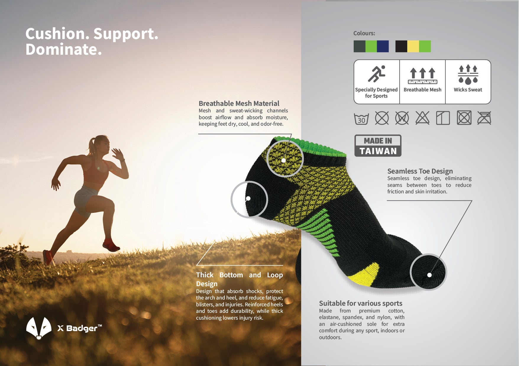 Keep your feet dry, comfortable, and odor-free! Our socks use a breathable, stretchy mix of high-quality cotton, elastane, spandex, and nylon.